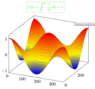 [latexpage] At first, we sample $f(x)$ in the $N$ ($N$ is odd) equidistant points around $x^*$: \[ f_k = f(x_k),\: x_k = x^*+kh,\: k=-\frac{N-1}{2},\dots,\frac{N-1}{2} \] where $h$ is some step. Then we interpolate points $\{(x_k,f_k)\}$ by polynomial \begin{equation} \label{eq:poly} P_{N-1}(x)=\sum_{j=0}^{N-1}{a_jx^j} \end{equation} Its coefficients $\{a_j\}$ are found as a solution of system of linear equations: \begin{equation} \label{eq:sys} \left\{ P_{N-1}(x_k) = f_k\right\},\quad k=-\frac{N-1}{2},\dots,\frac{N-1}{2} \end{equation} Here are references to existing equations: (\ref{eq:poly}), (\ref{eq:sys}). Here is reference to non-existing equation (\ref{eq:unknown}). \[ \quicklatex{color="#00ff00" size=25} \boxed{f(x)=\int_1^{\infty}\frac{1}{x^2}\,\mathrm{d}x=1} \]\begin{tikzpicture} [+preamble] \usepackage{pgfplots} \pgfplotsset{compat=newest} [/preamble] \begin{axis} \addplot3[surf,domain=0:360,samples=40] {cos(x)*cos(y)}; \end{axis} \end{tikzpicture}